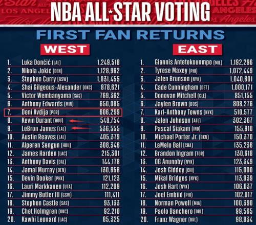 在首次公开全明星投票中,阿夫迪亚606299票,超过了杜兰特548754票、詹姆斯536555票,阿夫迪亚排在第七的位置。