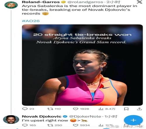 另一方面,女单世界第一萨巴伦卡在澳网期间实现了大满贯抢七20连胜,打破了由德约科维奇保持的纪录。赛后,在社交媒体上,得知此消息的德约科维奇在萨巴伦卡的动态评论区出现,并表示“我现在很生气”。