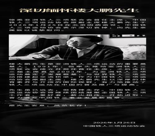 1991年,他牵头推动亚洲铁人三项联合会成立并担任首任主席,之后连任三届主席直至2003年,为亚洲铁人三项运动奠定了发展根基,与世界铁人三项运动搭建起交流桥梁。作为中国铁人三项运动协会原副主席,楼大鹏先生以深厚的体育素养与开阔的国际视野,有力地推动了铁人三项运动在中国的普及推广与提高。