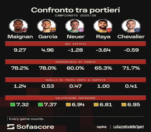 25/26赛季,米兰一门迈尼昂状态明显复苏,多次在关键比赛中力挽狂澜。据专业机构统计,法国国门的实际失球数要比预期失球数少9.27个,该项数据排名欧洲五大联赛第1位。好消息是,米兰即将以队内顶薪与其续约至2031年。